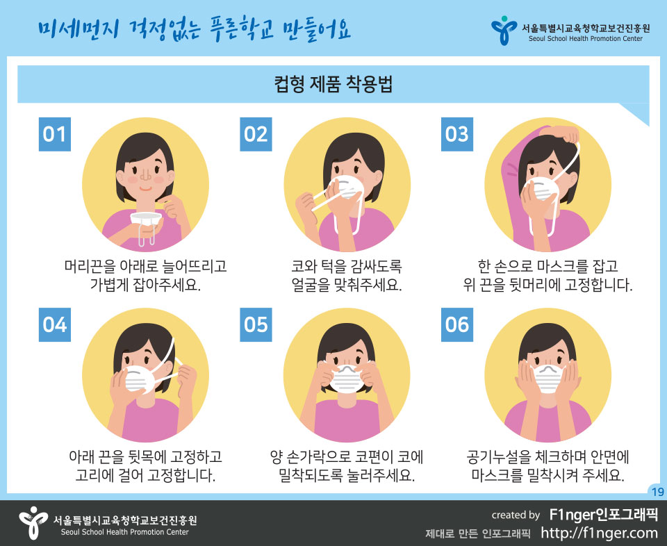 이것은 컵형인데 중요 한것은 5,6번 입니다. 과거 군대 다녀오신 분들은 방독면 착용법과 같습니다. 생화학 테러나 생화학전에서 방독면은 개인 전투력 보전을 위해 중요한데요. 마스크 착용법도 동일 합니다. 얼마전 뉴스에서 마스크 착용시 수염이야기가 있는데 음.. 면도도 하는것이 좋겠죠.. 결론은 얼굴에 완전 밀착이 되어서 들숨/날숨이 새거나 하면 안된다는 것 입니다. KF80이상을 썼는데, 평상시와 똑같이 숨을 쉴수 있다면.. 잘못 착용했을 가능성이 높습니다.. 마스크 부분이 밀착 되는 느낌이 든다면 제대로 착용 했다가 맞겠지요.